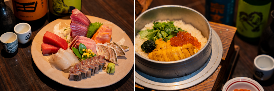 ご来店のほとんどのお客様が注文されるのが、名物の「お刺身盛り合わせ」と「釜飯」です。 お刺身は、自家製の海苔醤油で召し上がっていただく、鮮度抜群の旬の幸。 釜飯は、ご注文をいただいてからじっくりと炊き上げる、季節の香り豊かな逸品です。