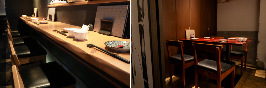 店内は、神田では珍しい落ち着いた和の空間。職人の手仕事が間近で見られるカウンター席のほか、デートや会食、ご接待にもご利用いただけるテーブル席、完全個室も完備しております。
