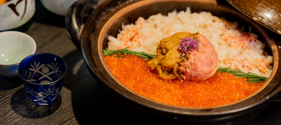 コースの〆を飾るのは、当店のスペシャリテ「拍手喝采土鍋ご飯」。 蓋を開けた瞬間に歓声があがる、いくら・ズワイ蟹・生雲丹を贅沢に使用した自慢の土鍋ご飯が、特別な夜を彩ります。(※ご提供はコース内容により異なります)