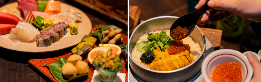 「神田 居酒屋こころ」でご愛顧いただいている、自家製海苔醤油で味わう「お刺身盛り合わせ」や、ご注文ごとに炊き上げる「季節の釜飯」は、もちろん「となり」でもご提供しております。